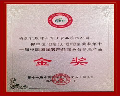 酒泉敦煌種業(yè)百佳食品公司“敦煌飛天”脫水蔬菜榮獲第十一屆中國國際農(nóng)產(chǎn)品交易會(huì)金獎(jiǎng)